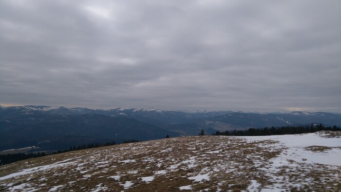 Snímka 2 – Pod Holým vrchom. Odtiaľto vedia zelená značka do Závadky. Modrá pokračuje na Bukovec.