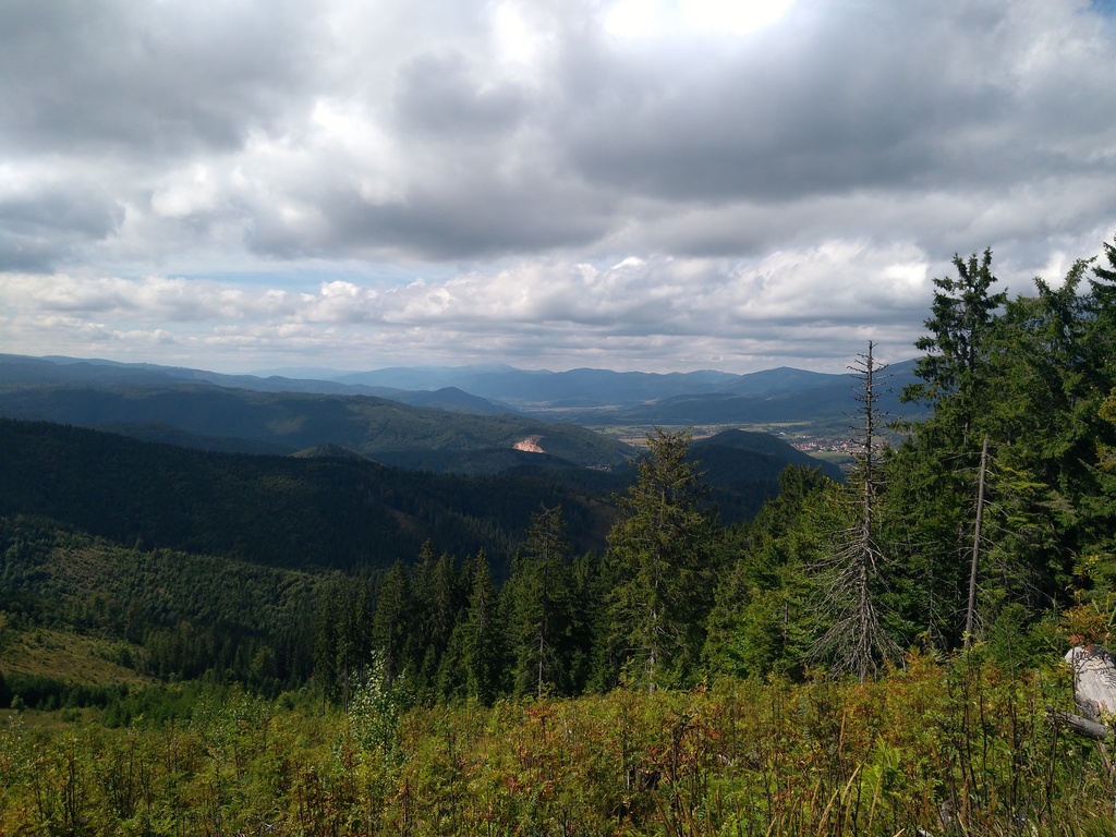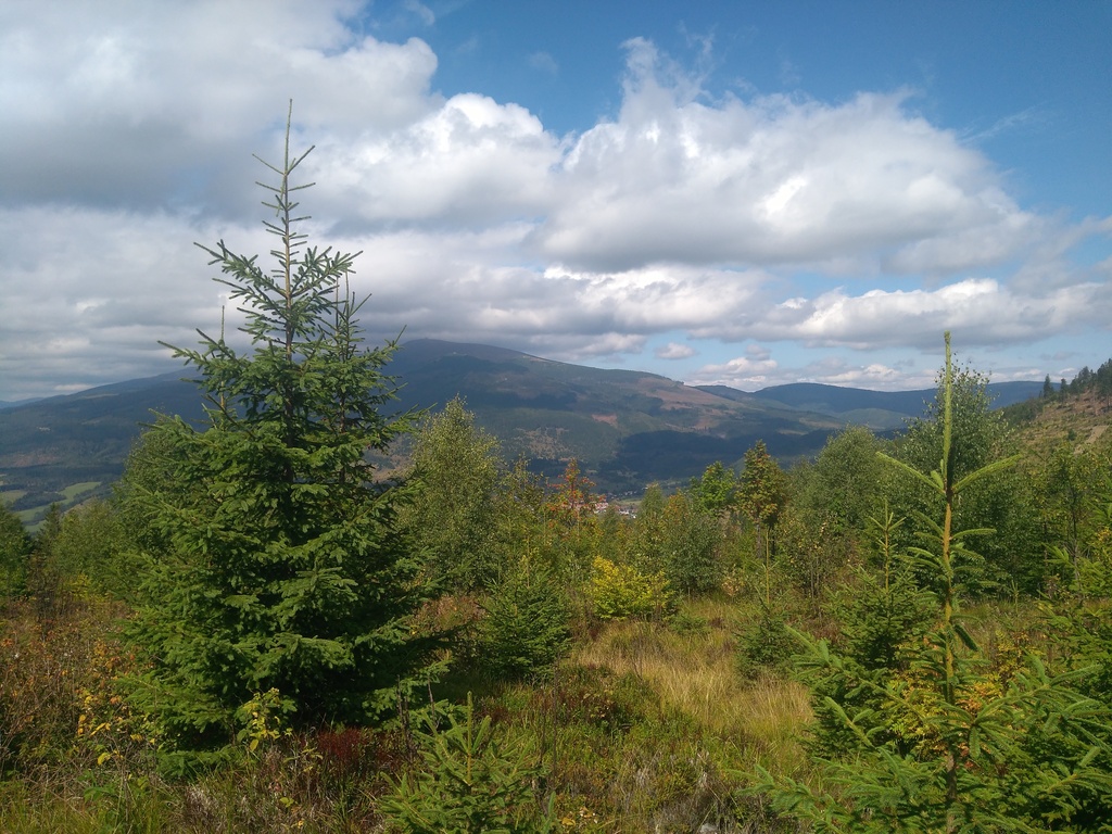 Snímka 8 – Výhľad na Kráľovu hoľu, vysielač je však v mrakoch. Domčeky za stromami v strede snímky patria Telgártu.