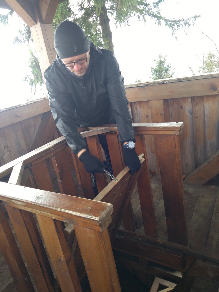 Snímka 16 – Miroslav Benian zaisťuje padacie dvierka na najvyššom poschodí.