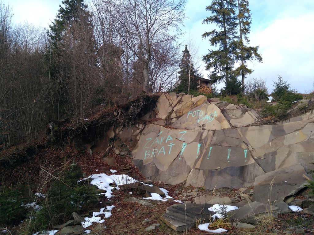 Snímka 9 – Tesne pod rozhľadňou. Ľudia tu zrejme svojpomocne štiepali kameň, no je to zakázané.