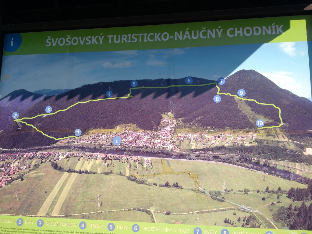 Snímka 1 – Prvá tabuľa náučného chodníka v strede Švošova. Hneď vidíte, že väčšinou pôjdete po lese, čo je výhoda v letných horúčavách. Výhľady ponúkne len lúka pri 9. zastávke.