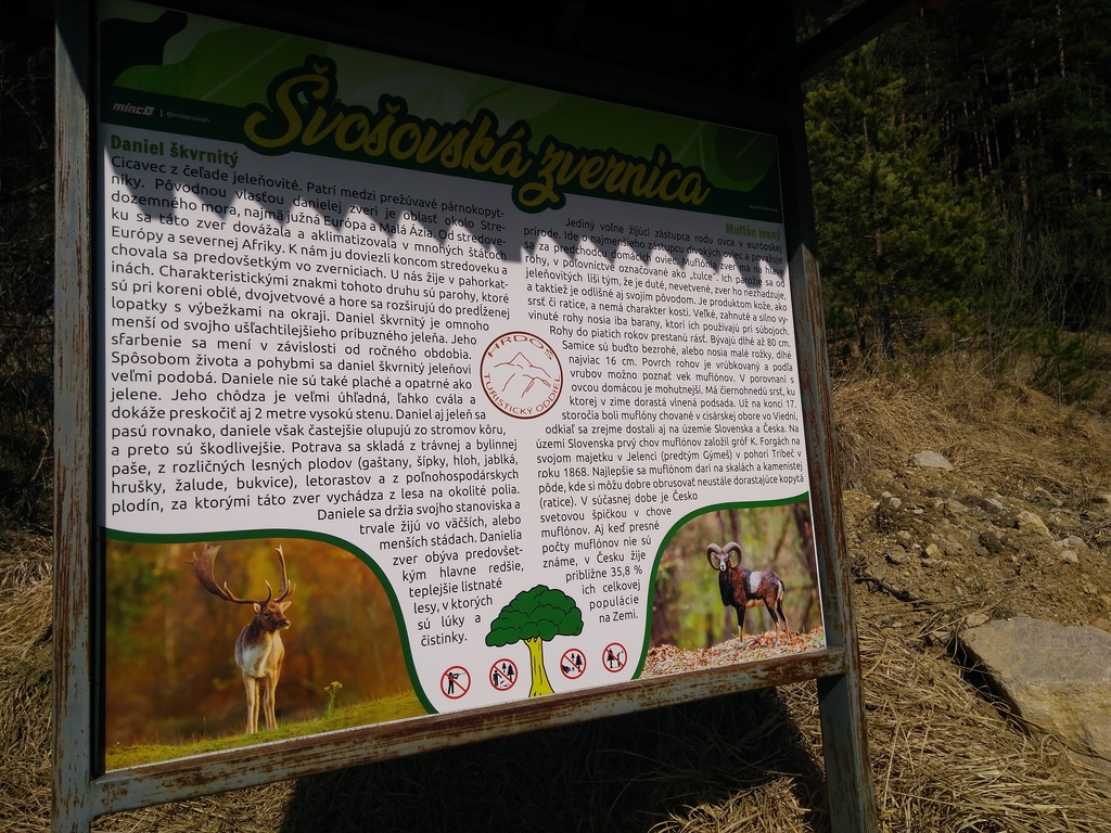 Snímka 8 – Pri zvernici nájdete informácie o danieloch a muflónoch. Strom na spodku tabule je zlatokmenná borovica, ktorú má Švošov v erbe.