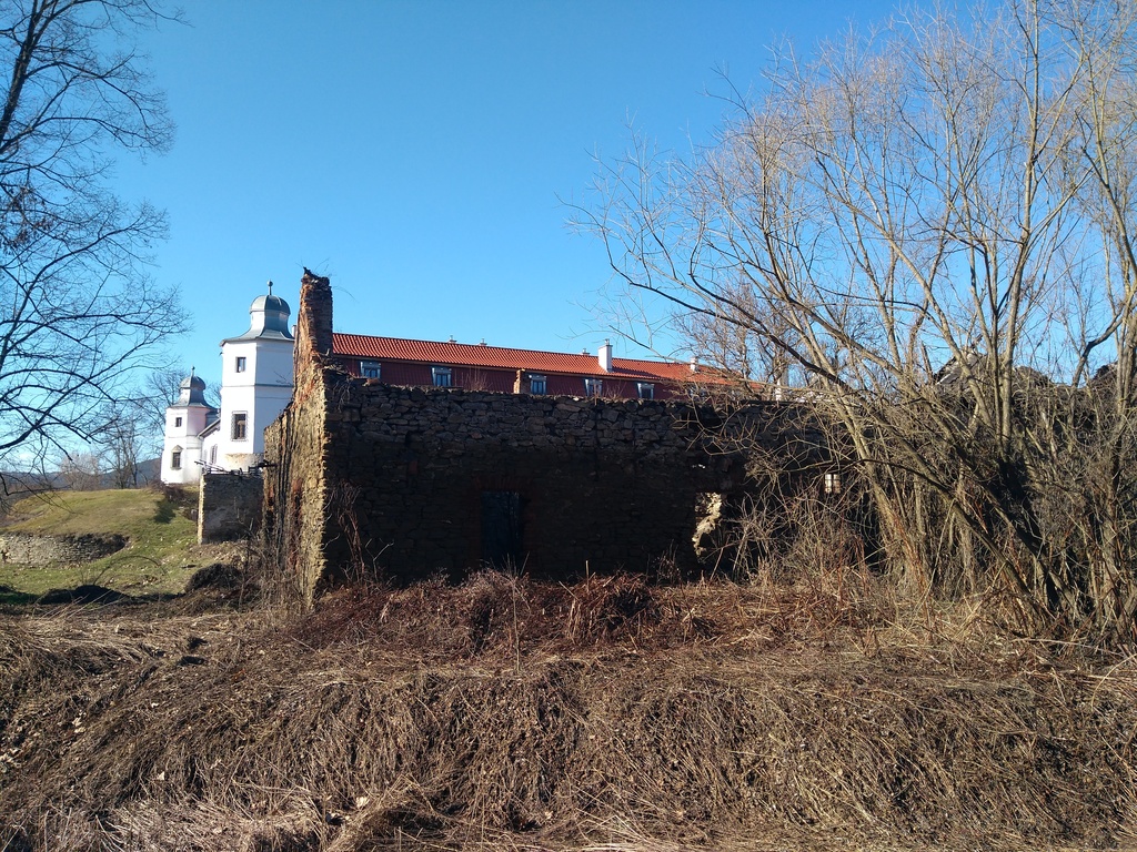 Snímka 18 – Náučný chodník sa končí znovu v centre Kluknavy. Vraciame sa tam popri kaštieli; vpredu zvyšky hospodárskych budov, vzadu obnovená stavba.