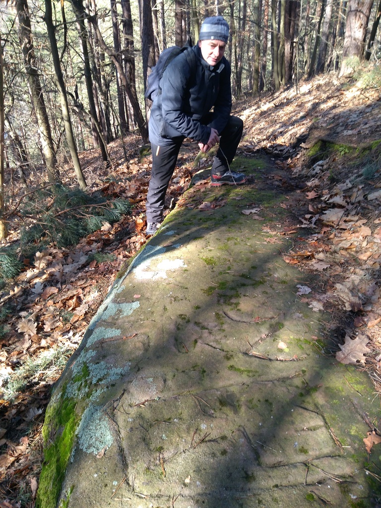 Snímka 8 – Pri troch duboch a informačnej tabuli nájdete ploskú skalu s runami. Ich pôvod je nejasný. Vedľa Peter Šmída.