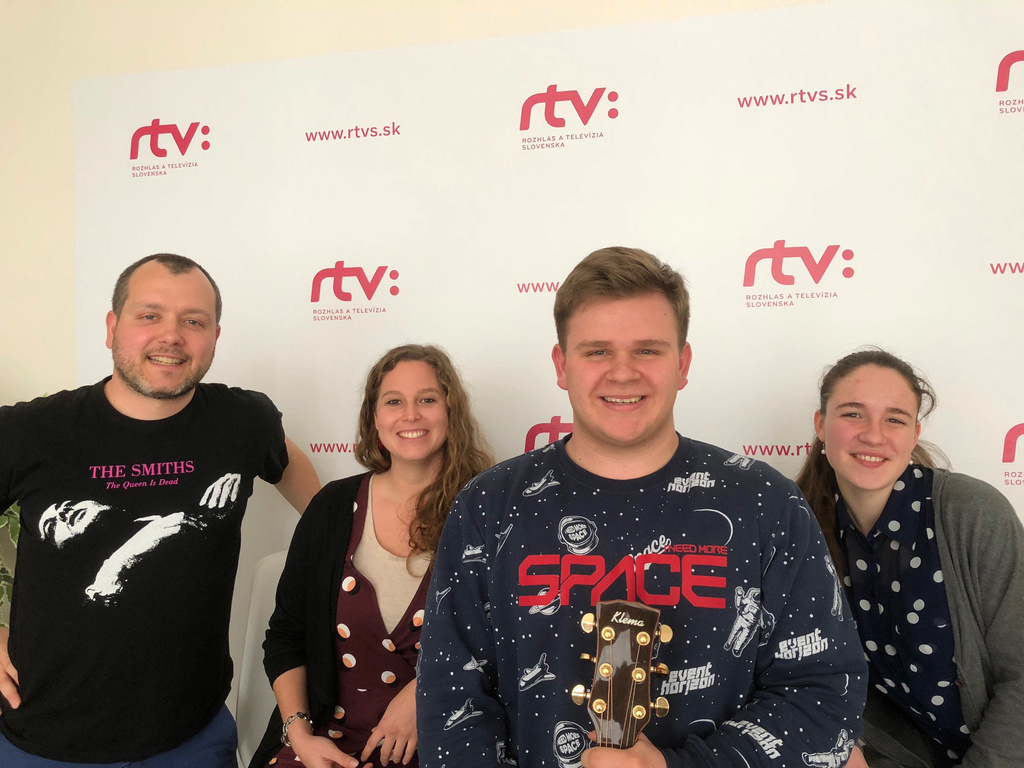Na snímke zľava: riaditeľ Alliance Francaise v Banskej Bystrici Thomas Laurent, stredoškolská učiteľka francúzštiny Iva Ivaničová, študenti Katolíckeho gymnázia Štefana Moysesa Julián Jarábek a Viktória Jarábeková.